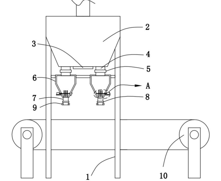 物料由料倉通過閘板閥進入重力給料裝置,再經過給料器給料,進入稱重計量裝置,通過與稱重料倉相連的稱重傳感器的稱重儀表發出重量變化信號,并由稱重儀表根據預定值控制給料裝置的關閉。當稱量結束后稱量斗門打開,物料經過緩沖充料斗進入夾袋機構上的空袋中。等待所有物料落入口袋后,儀表判穩,累計后,自動松袋,口袋落入輸送機。輸送機將稱重完成口袋輸送至縫紉機處,操作工將口袋整理至縫紉機處縫包,輸送機將封口后的成品袋送至碼垛處碼垛,至此一套工序完成,如繼續循環即可。
